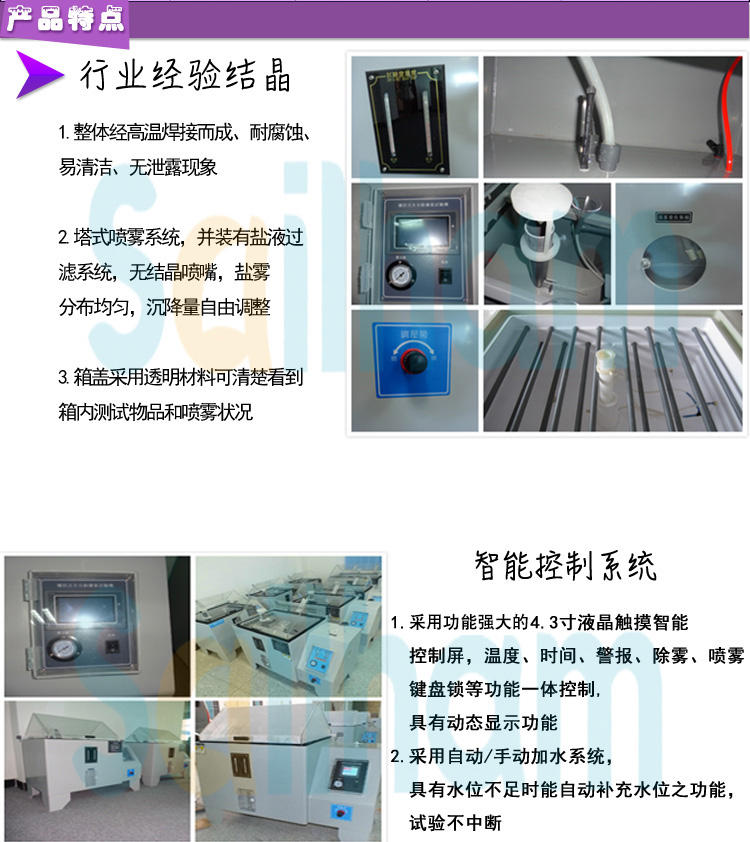 大型鹽霧試驗(yàn)室體制作材料:1. 鹽霧試驗(yàn)箱整體為進(jìn)口PVC增強(qiáng)硬質(zhì)塑料板,表面光潔平整,并耐老化、耐腐蝕;摒棄玻璃鋼材質(zhì)應(yīng) 時(shí)間而產(chǎn) 生表面退色纖維化.全塑結(jié)構(gòu)鹽霧試驗(yàn)箱更能滿足長期強(qiáng)酸、強(qiáng)鹽霧試驗(yàn)爾不產(chǎn)生任何損傷。
